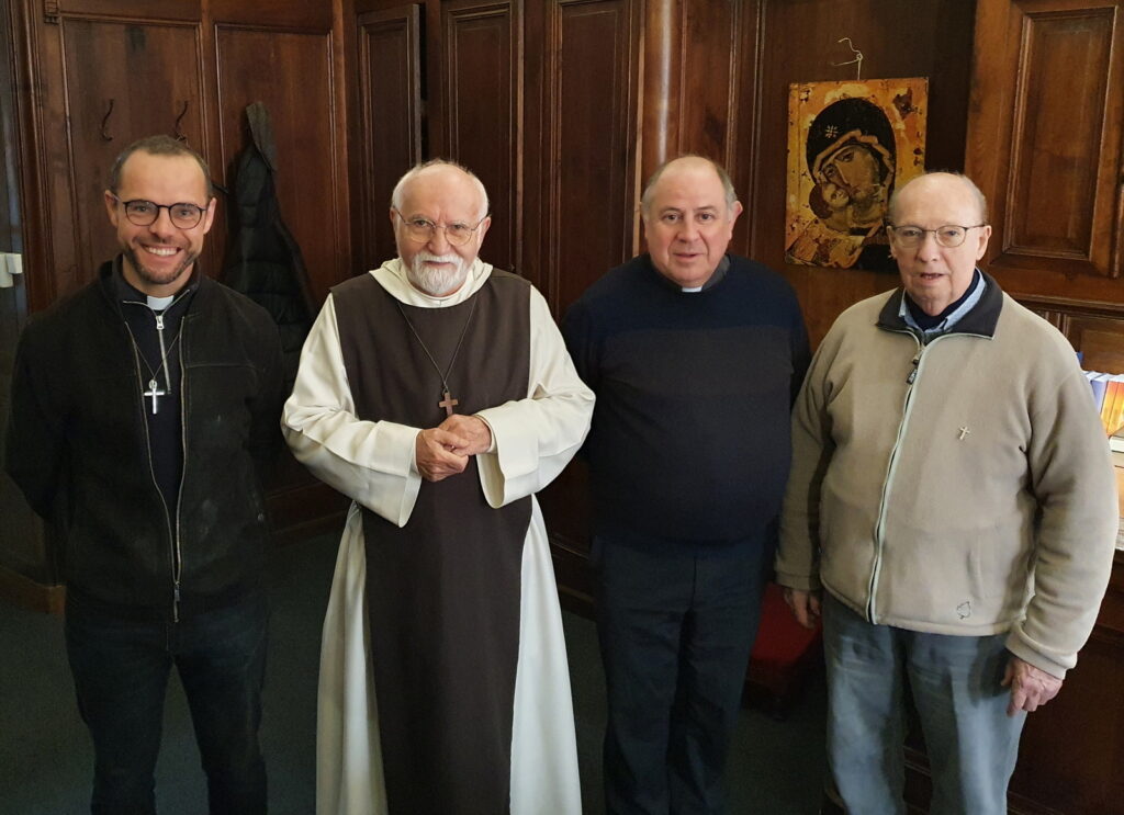 le Père Jacques accueilli par nos prêtres : Guillaume, Gaëtan et Francis